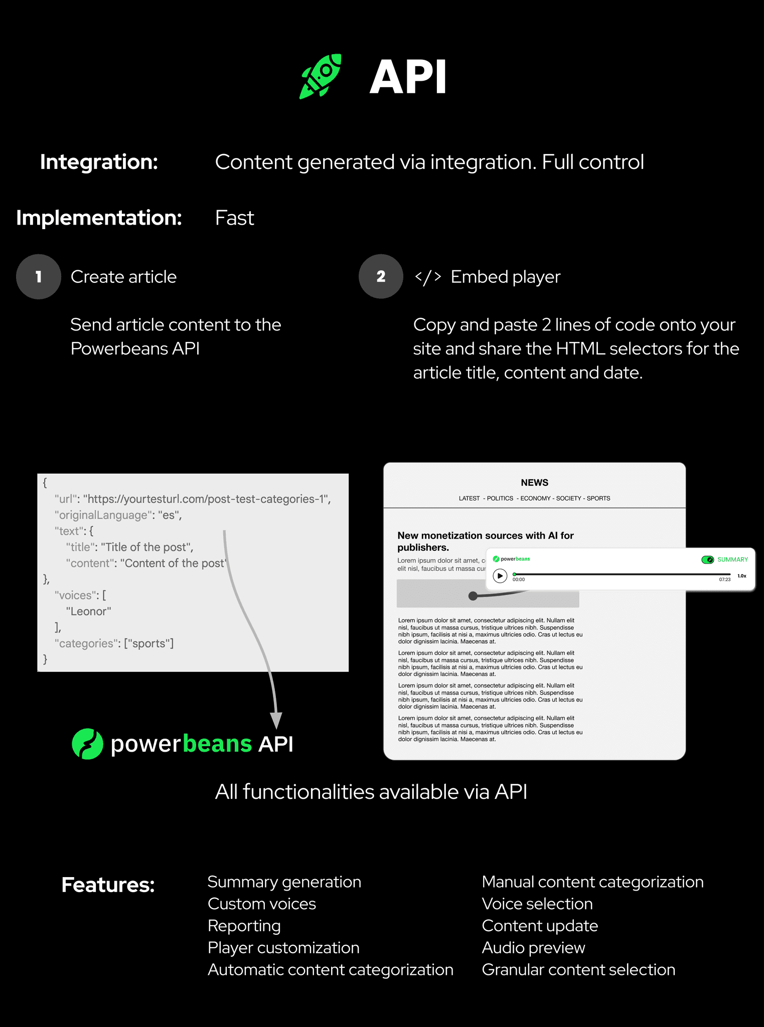 For all implementations where you need more control or make use of advanced features, using the Powerbeans player through the API could be a good idea. This will require you to send the content of your articles so we can process them as audio. Then, the player will be automatically rendered in all those URLs whose content has been created.