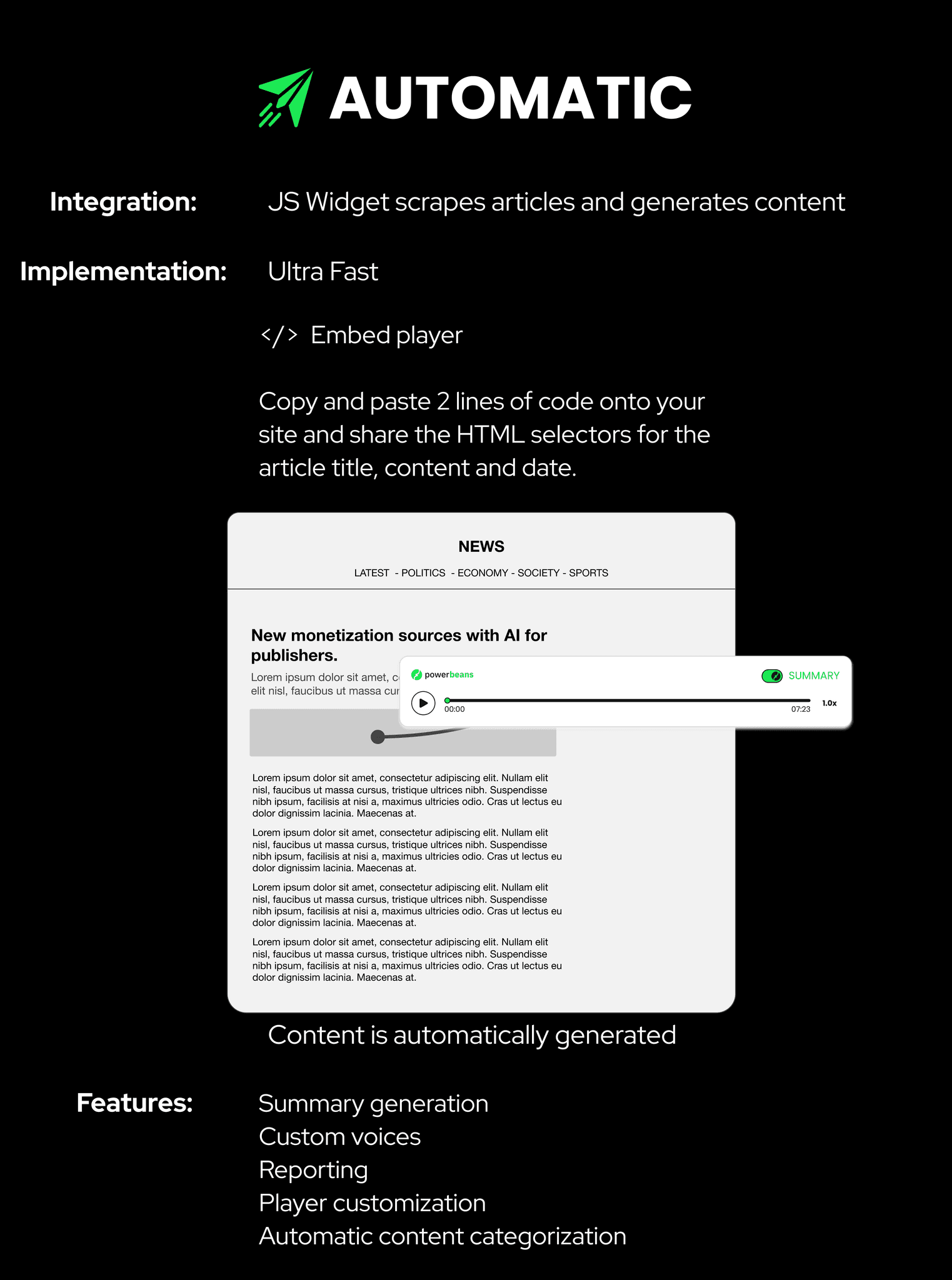 Welcome to the Powerbeans Player Automatic Integration Guide! This guide will walk you through setting up the Powerbeans Player on your website quickly and easily. The Powerbeans Player is a powerful AI solution that automatically converts your existing articles into engaging audio content, giving your users a new way to consume your content, either in full or as a concise summary.